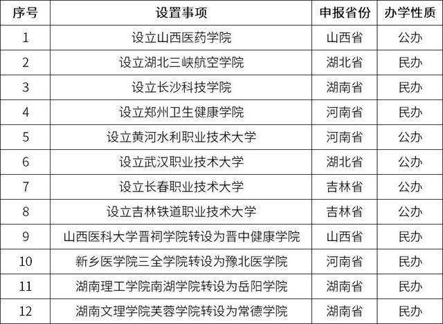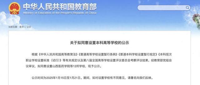 1月15日,教育部网站发布了《关于拟同意设置本科高等学校的公示》,根据《中华人民共和国高等教育法》《普通高等学校设置暂行条例》《普通本科学校设置暂行规定》《本科层次职业学校设置标准(试行)》等有关规定以及第八届全国高等学校设置评议委员会考察评议结果,经教育部党组会议审议,拟同意设置山西医药学院等12所学校。